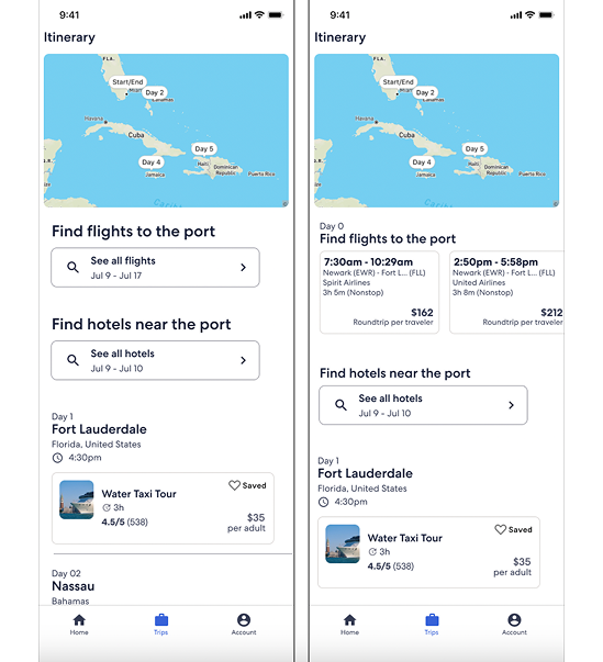 By centralizing all their trip details—flights, hotels, cruise, and activities—the itinerary builder solved a major pain point for users. It seamlessly incorporated booking information, like hotel check-out times, port departure times, and displayed activities in chronological order on the timeline.